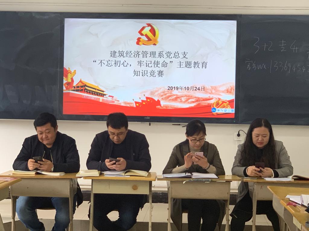 为了全面检验本次主题教育学习教育的成效,根据学院党委安排,建筑经济管理系党总组织“不忘初心,牢记使命”主题教育知识竞赛,于2019年10月24日在二号教学楼5-11教室集中进行竞赛答题。
