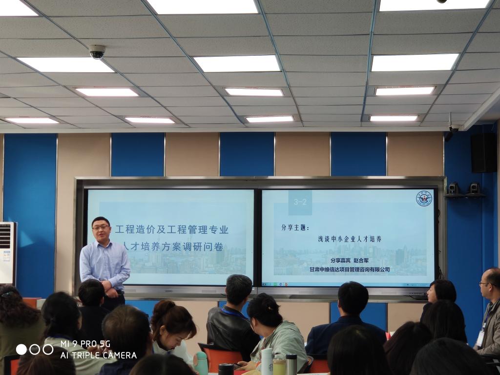 首先甘肃省建设工程造价管理协会薛勇理事长对本次活动致辞,接着,建经系第一党支部书记杨文娟老师介绍了开展本次研讨活动的意义,表示立德树人是我们的初心,培养优秀的专业人才是我们的使命,我院愿与行业企业精诚合作,与兄弟院校携手共进,共同探讨关于专业建设及人才培养的课题。研讨会上,我院工程管理教研室主任何丽琴老师,甘肃中维信达项目管理咨询有限公司的赵合军副总经理,甘肃鸣森项目管理咨询有限公司胡晓黎总经理,兰州西部投资咨询有限公司经理助理岳香菊,兰州一砖一瓦教育科技有限公司王静等院校和企业代表就产教融合,校企合作做了精彩的分享。