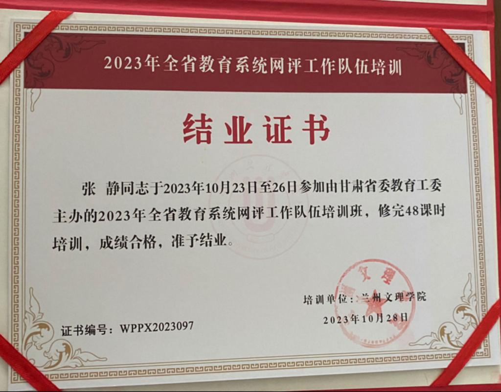 为进一步推动“三抓三促”走深走实提升教育系统网络舆情处置水平,提高网评员业务素质,规范网评工作,保证网络舆情及时、准确、有效的收集、研判和处置,我系干事张静老师被推荐参加了“2023年全省教育系统网评工作队伍培训班”,此次培训在兰州文理学院举行,为全省教育系统网评员提供了很好的学习机会和交流平台。通过本次培训,张静老师收获颇多,总结如下: